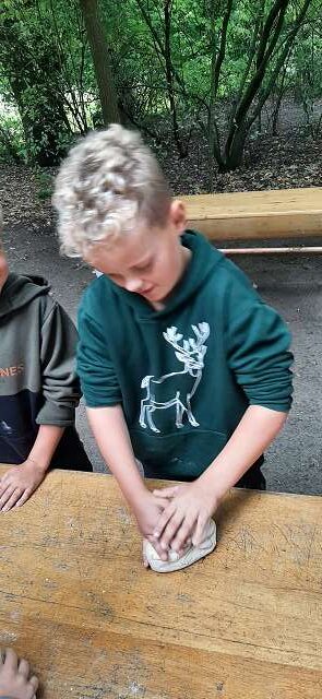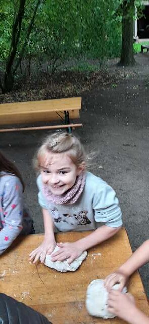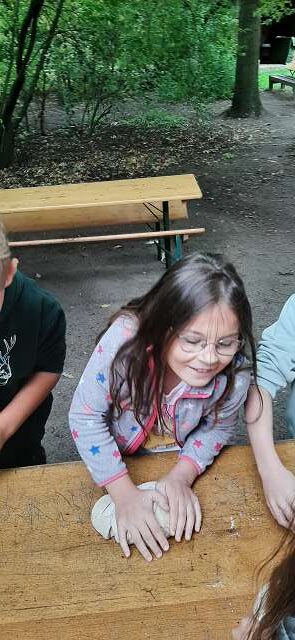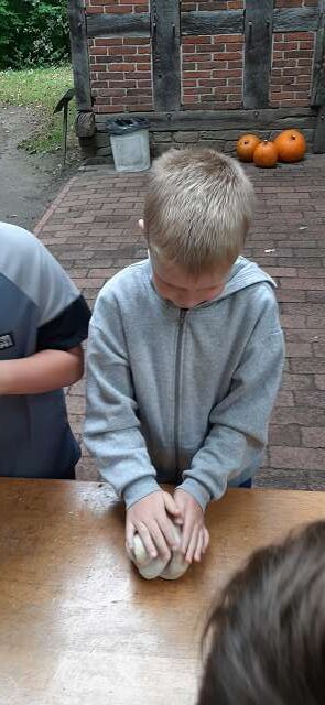 In der alten Bockwindmühle wurde erklärt, wie aus Korn Mehl entsteht. Danach ging es zur Hofanlage „Wehlburg“. Dort durften die Schülerinnen und Schüler vor dem historischen Backhaus selbst aus Teig Brote formen: Sie bekamen ihren eigenen Brotteig und fertigten daraus kreative >Brot-Kunstwerke <– von Herzen über Zöpfe bis hin zu Igeln.